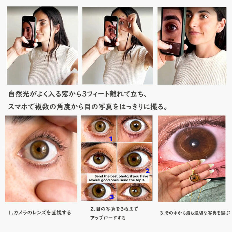 目の写真を3枚までアップロードしていただき、その中から最も適切な写真を選んでジュエリーをお作りします。(写真の枚数と商品の枚数は同じではありません)