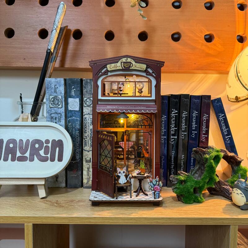 ブックヌック キット 喫茶店 立体パズル ミニチュア ドールハウス 組み立て 本棚装飾 LED付き イラスト説明書付き