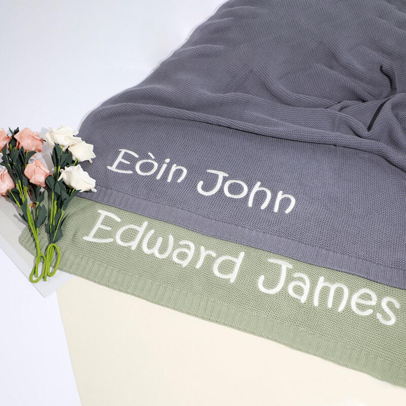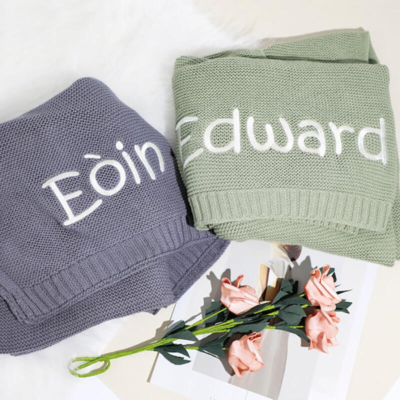 好きな言葉や名前刺繍入りで、「世界で1つだけ」のニットブランケットになります。