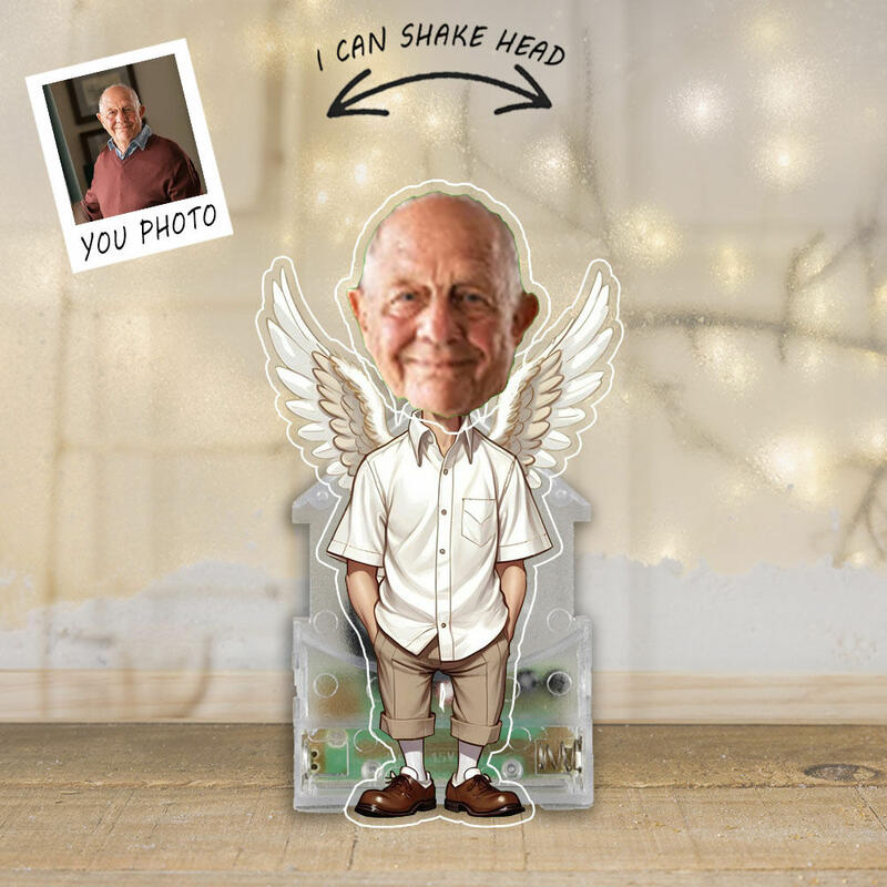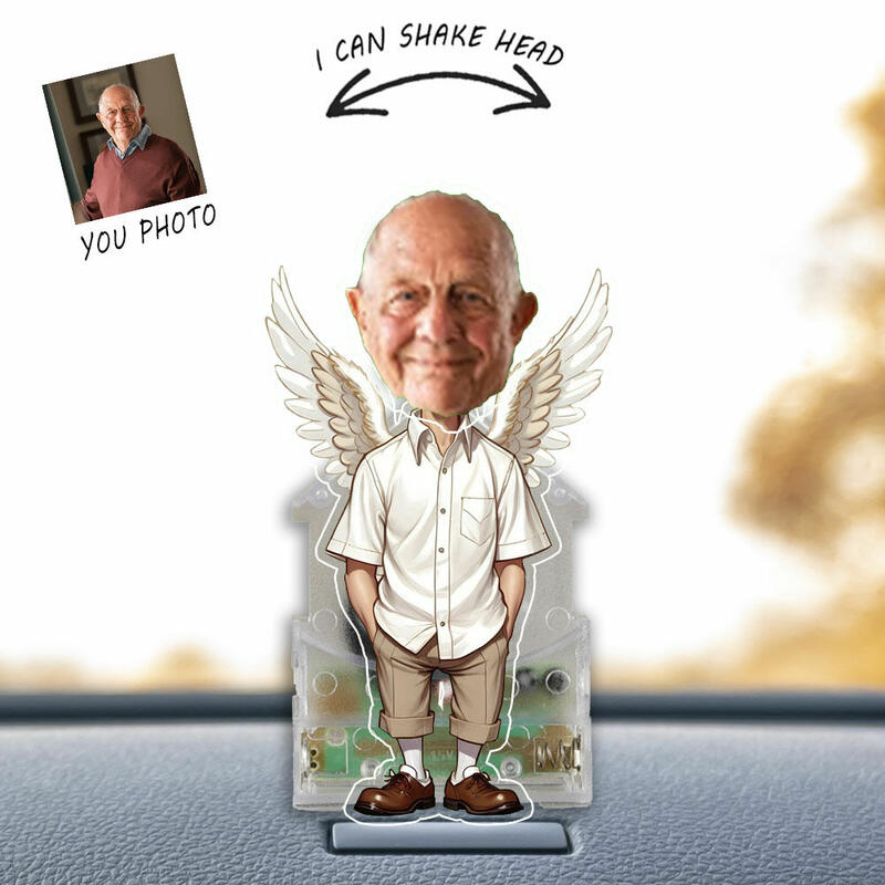 天使の翼 カスタマイズ 写真入れ 首振り アクリル スタンド ボブルヘッド 思い出 メモリアル 祖父 おじいさん 父の日 車飾り 玄関飾り 卓上飾り