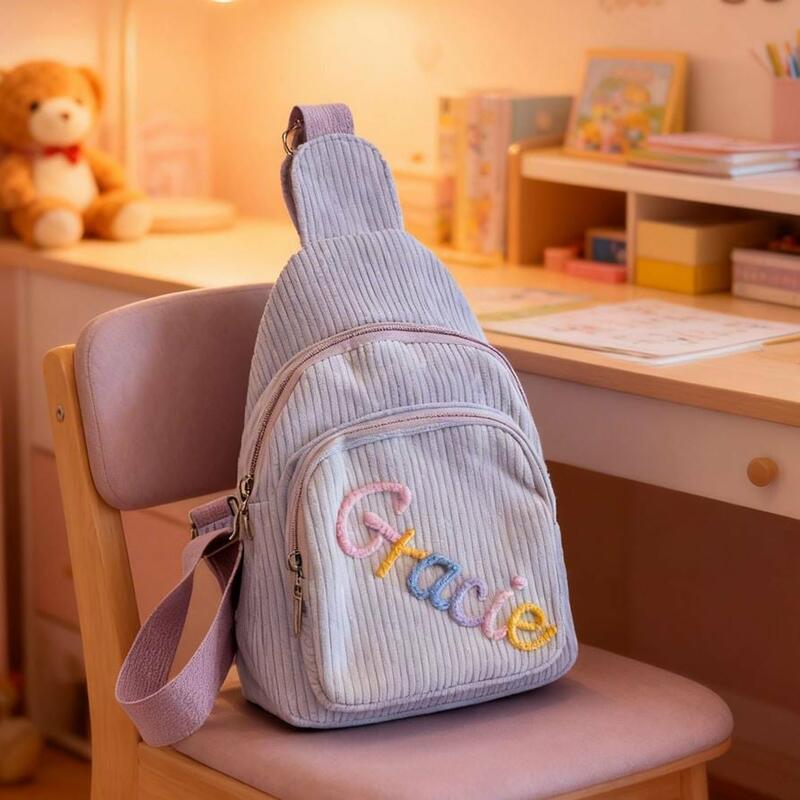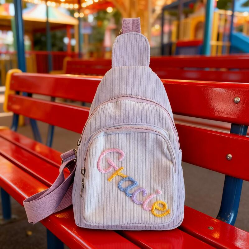 かわいさと実用性を兼ね備えるお名前かぎ針編み入りボディバッグです。