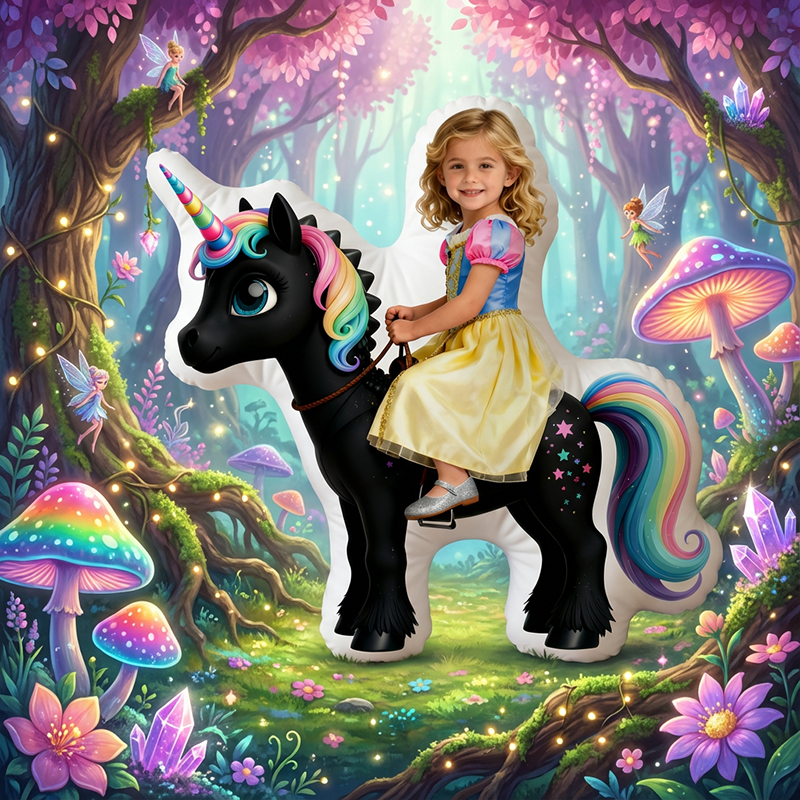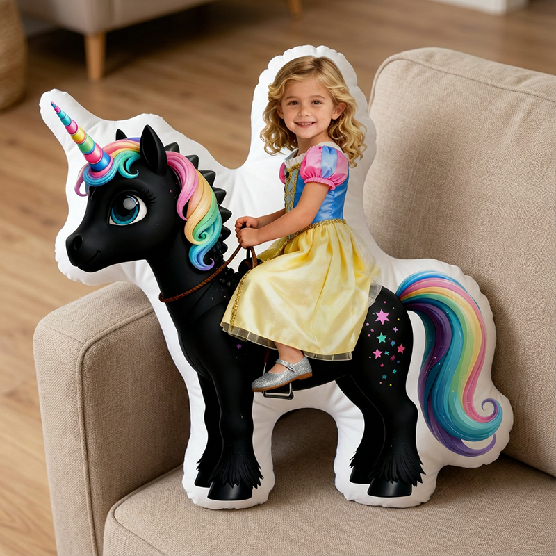 Personalized Face Portrait Pillow with Black Unicorn Pattern Unique Present for Girls