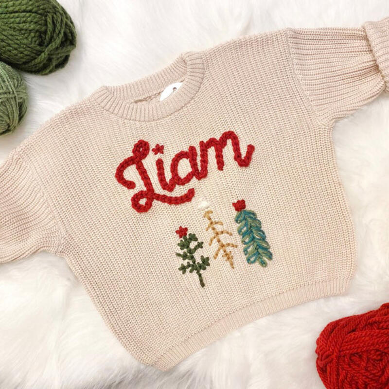 お名前やメッセージ入りのかわいいキッズニットセーターになります。
