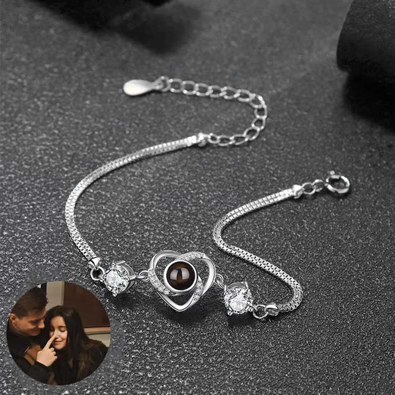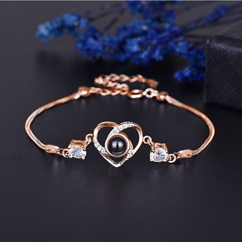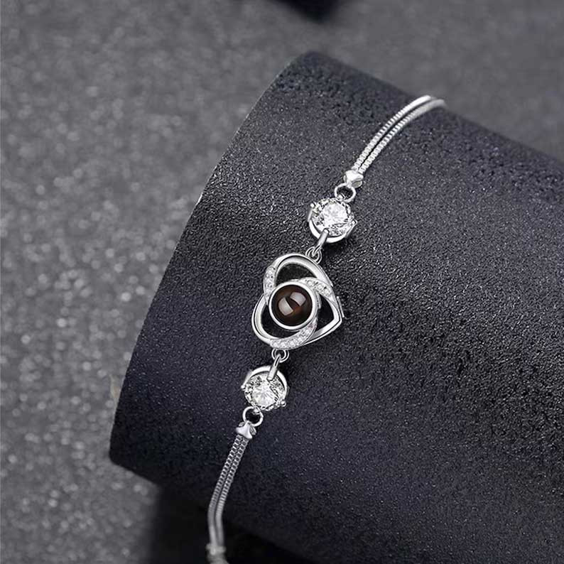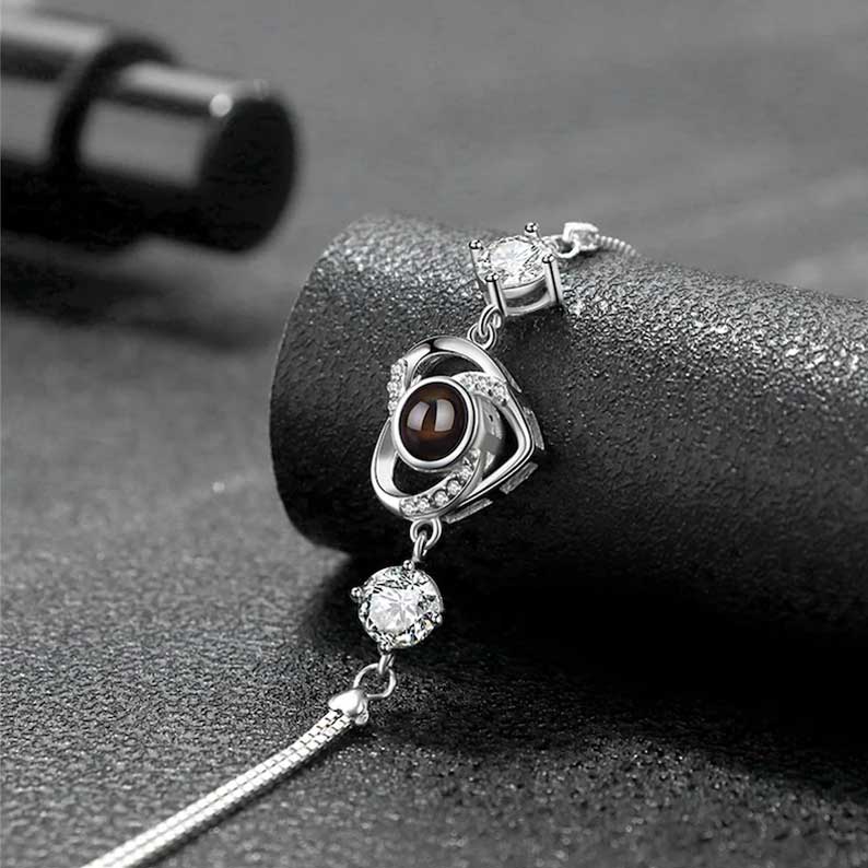 投影ブレスレットはナノテクノロジー技術を用いて、写真をストーンの中にセッティングして、スマホのライトを中心部分にかざすと、お気に入りのベストショットが浮かび上がります。