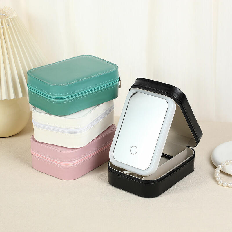 LEDライト付き鏡が内蔵されていることはポイントでです。仕切りの調整でそれぞれのジュエリーや化粧道具を入れられます。