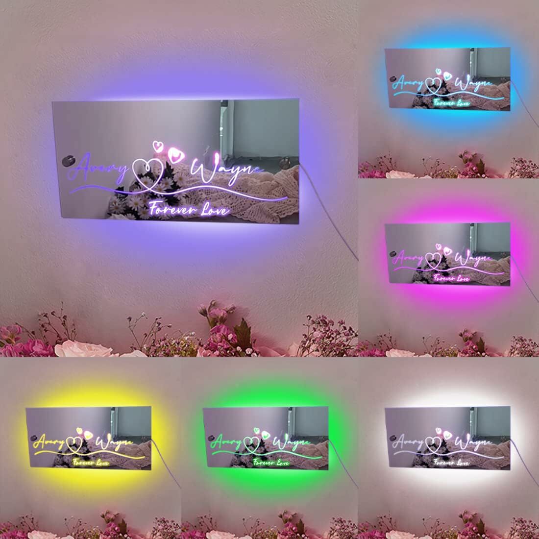 カスタマイズ 名前 文字入れ LED ミラー 発光 ライト 壁掛け 12色変化 屋内装飾 リモコン付き 壁フック付き