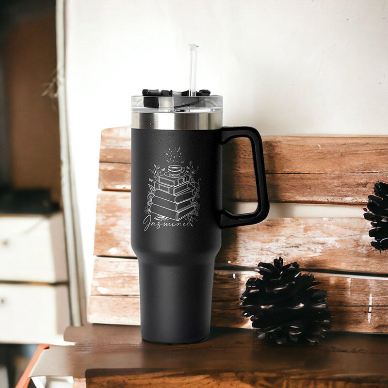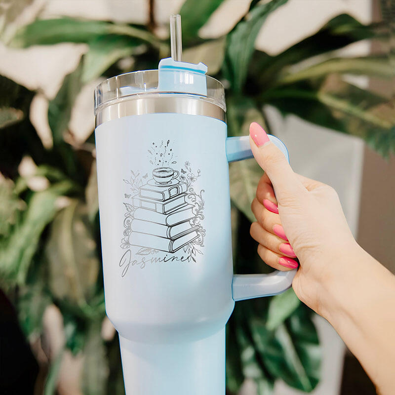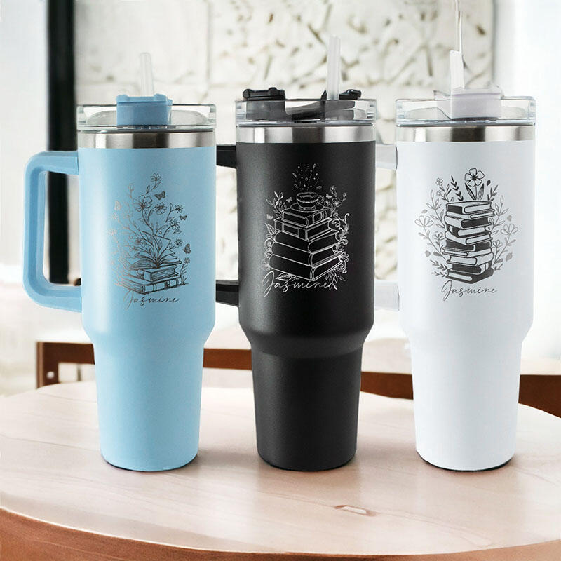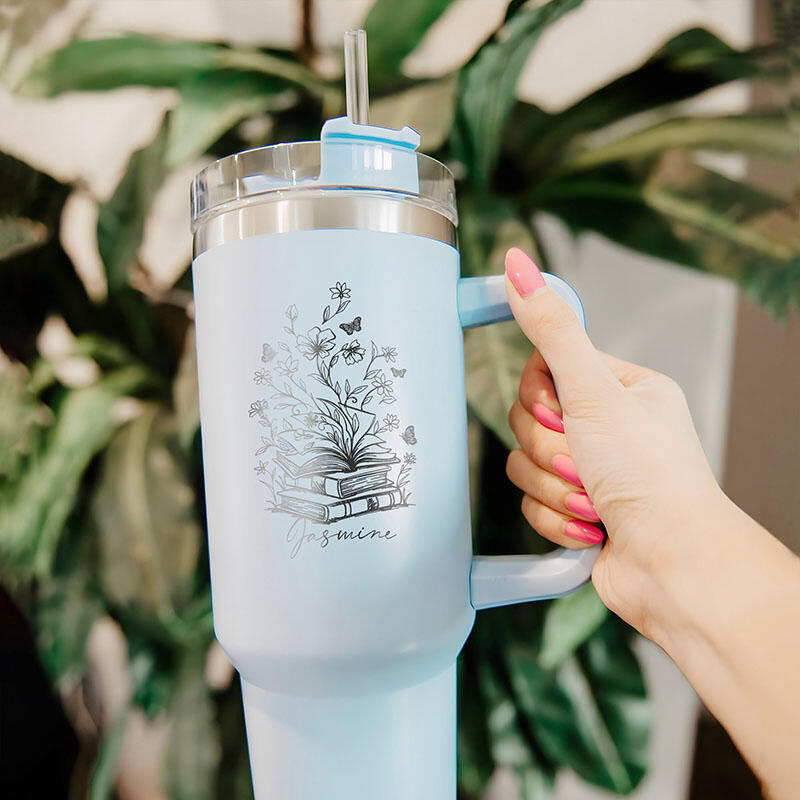 カスタマイズ ネーム入り タンブラー 先生への贈り物 オリジナル アウトドア 運転 通勤 通学 ブック 花 フラワー ストロー付き 蓋付き