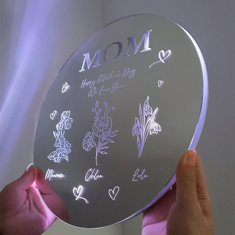 カスタムイズ 名前入れ 誕生花 LED ミラー 発光 ライト 壁掛け 屋内装飾 リモコン付き 12色変化 壁フック付き 母の日