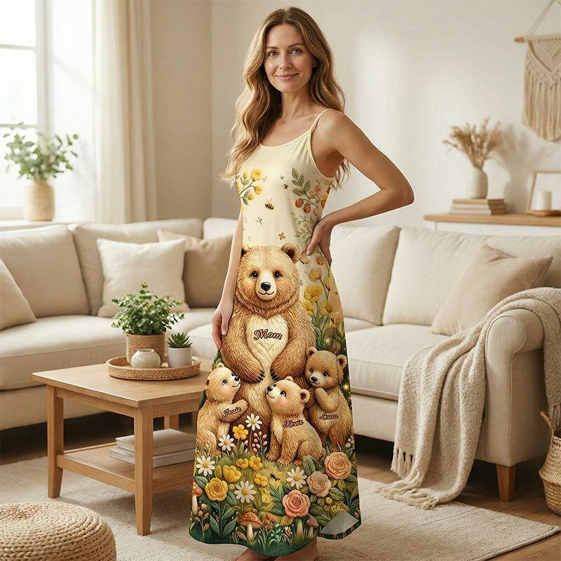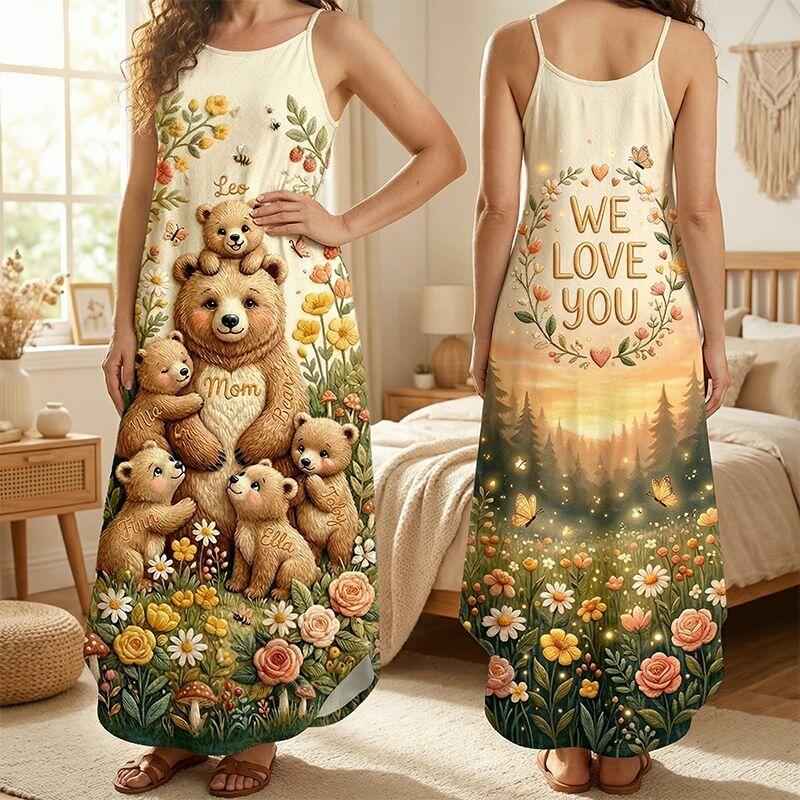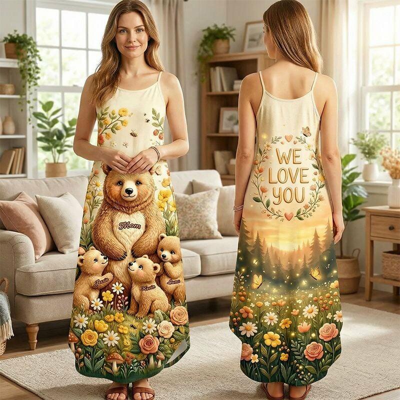 Personalized Suspender Maxi Dress Mama Bear Custom Kids Names Delicate Gift for Mother's Day