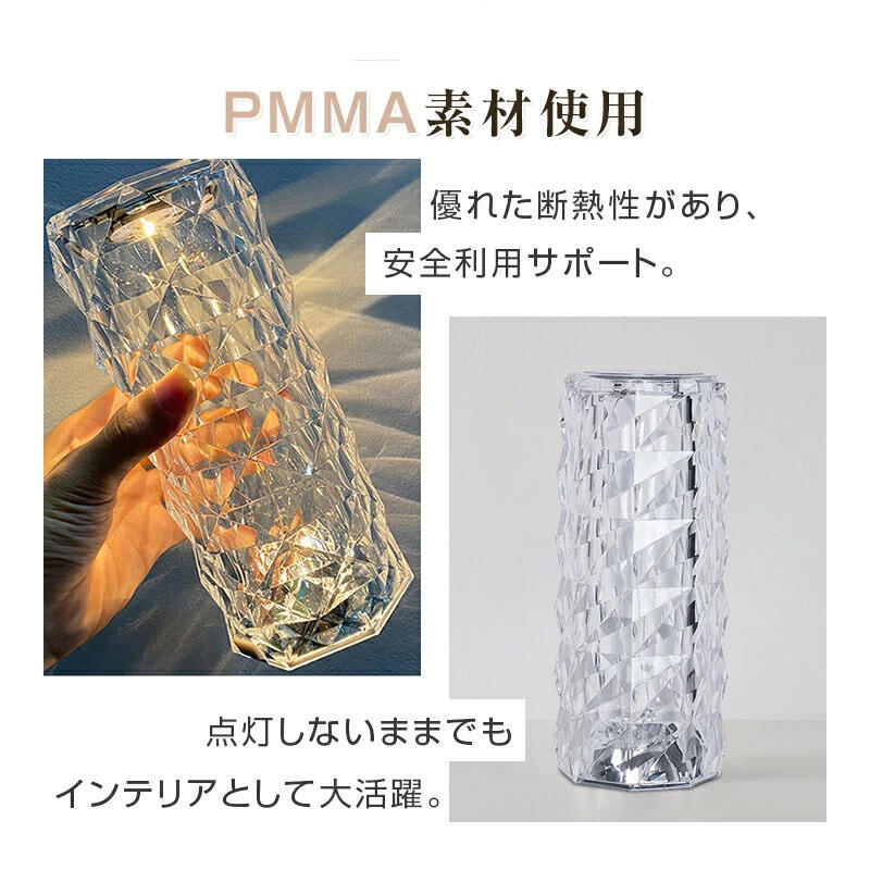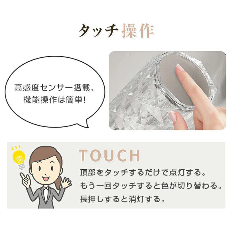 上質なアクリル素材を使って、クリスタルガラスのようにし、多角構造から拡がる幻想的な煌めきと美しい光を灯す、コードレステーブルランプ。人をもてなす灯りとしてテーブルに彩りを与え、最良なシーンをつくりだします。コンパクトで美しい灯りをどこにでも!インテリアだけでなく、多様なシーンで大活躍のライトです♪